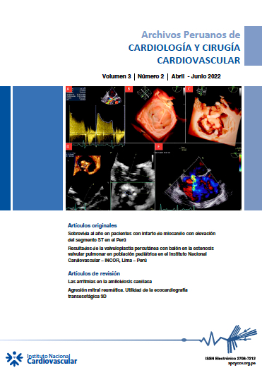 Archivos Peruanos de Cardiología y Cirugía Cardiovascular creada en diciembre del año 2019, es la revista científica oficial del Instituto Nacional Cardiovascular - INCOR del Seguro Social de Salud del Perú. Es una publicación exclusivamente virtual, arbitrada por pares, de periodicidad trimestral... (Ver más...)